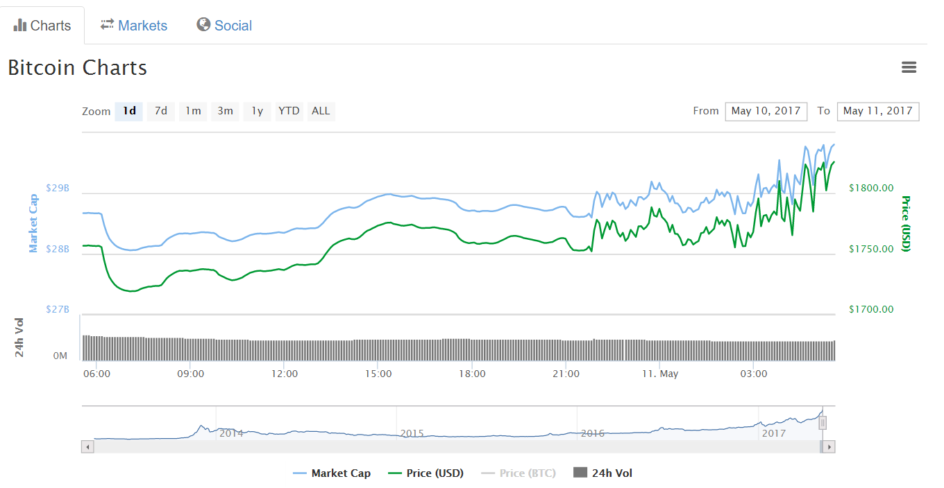 Утром в четверг, 11 мая, цена биткоина, взяв небольшую паузу накануне, снова устремилась вверх и превысила $1800.