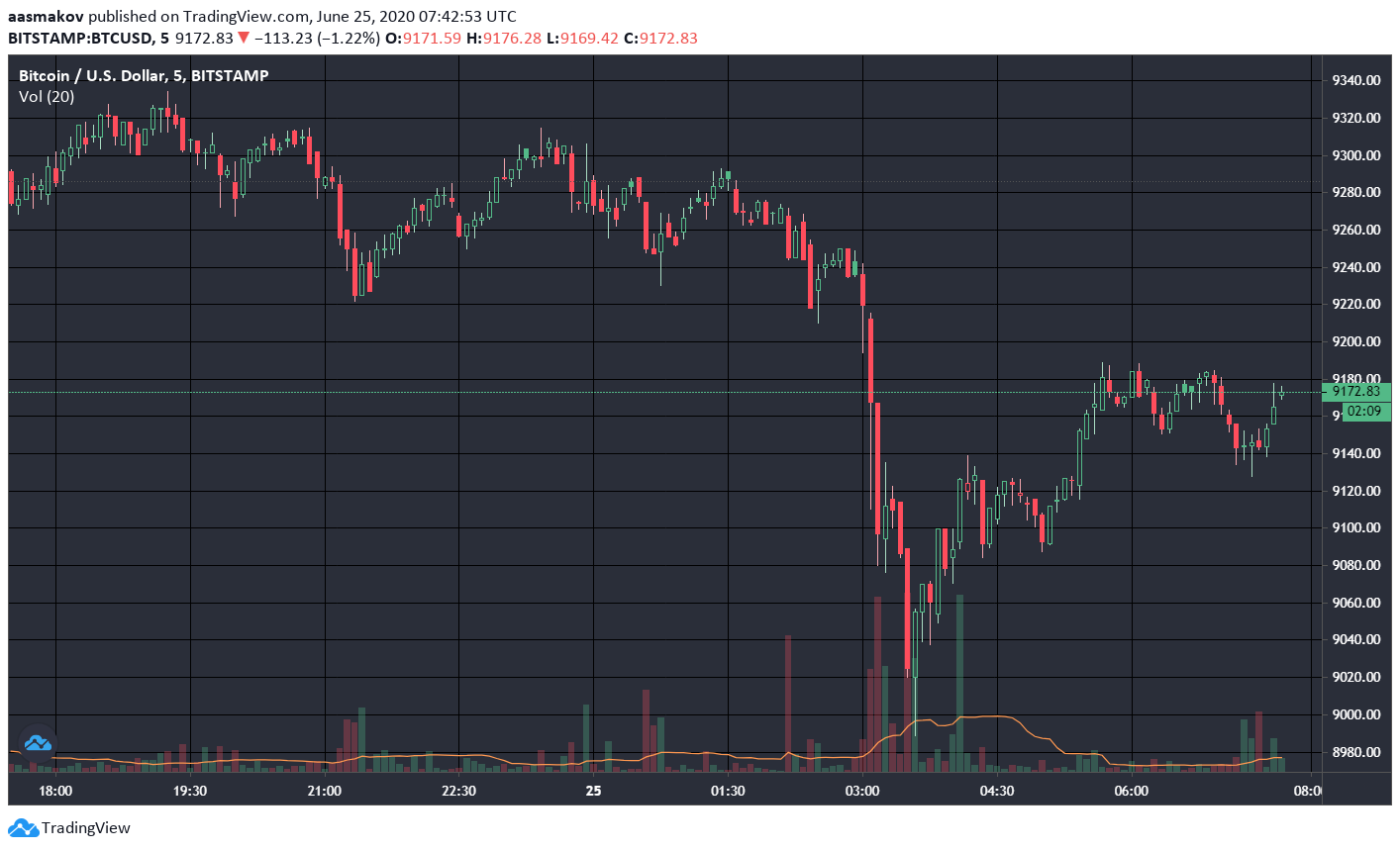 На момент публикации наблюдается отскок от суточного минимума. За несколько часов BTC прибавил 2%, достигнув $9175.