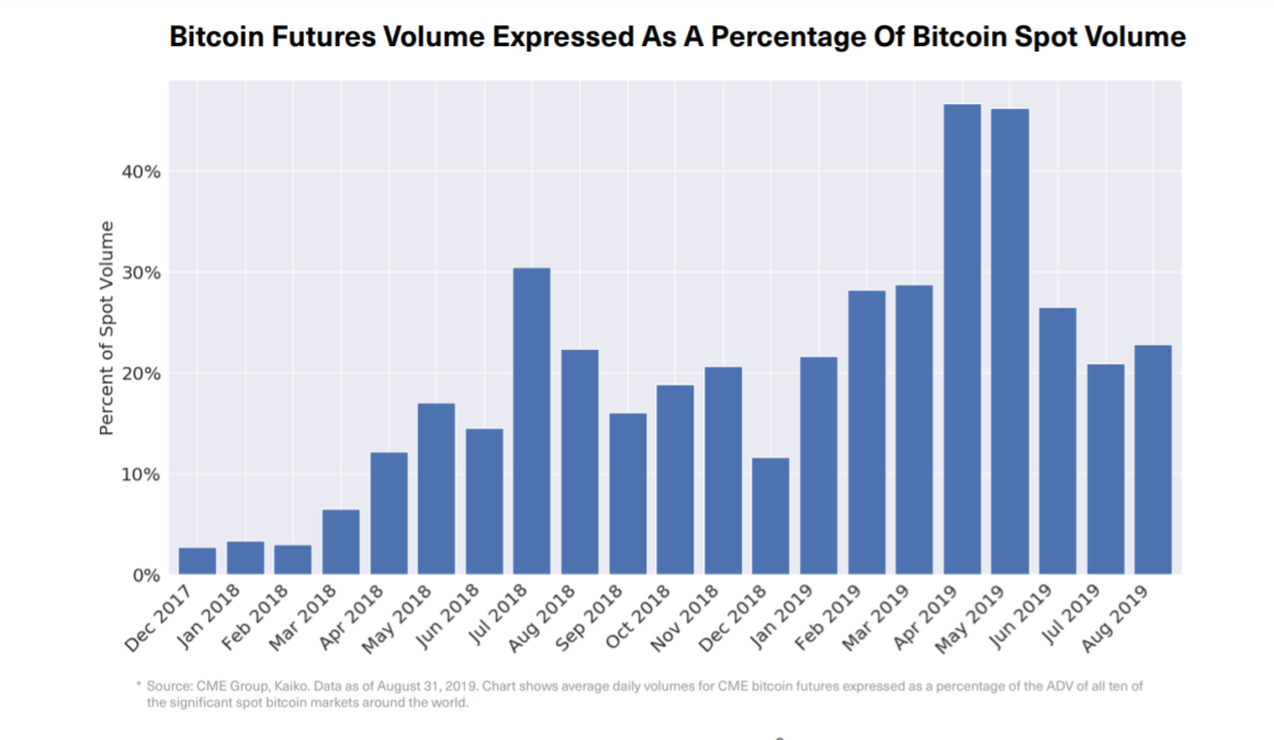 На третьей диаграмме фирма показала значительный рост регулируемого фьючерсного рынка. Bitwise подчеркнула, что в августе средний дневной объем биткоин-фьючерсами превысил $234 млн.
