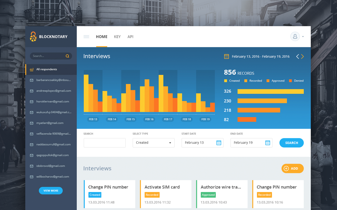 В функционале BlockNotary Dashboard заложены опции по быстрому созданию и мониторингу уже пройденных интервью. Клиент может создавать необходимое количество вопросов и задавать минимальное/максимальное время на их прохождение. В интервью предусмотрено три типа вопросов: 1. заявление; 2. предъявление документа; 3. чтение сессионного ключа.