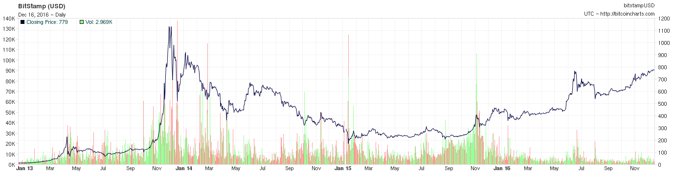 Тем не менее, с осени прошлого года наблюдается устойчивая тенденция к росту биткоина, который на сегодняшний день торгуется чуть ниже $800. Эксперты и аналитики называют различные причины происходящего – от контроля над движением капиталов в Китае до попыток изоляционистской политики в США и Великобритании.
