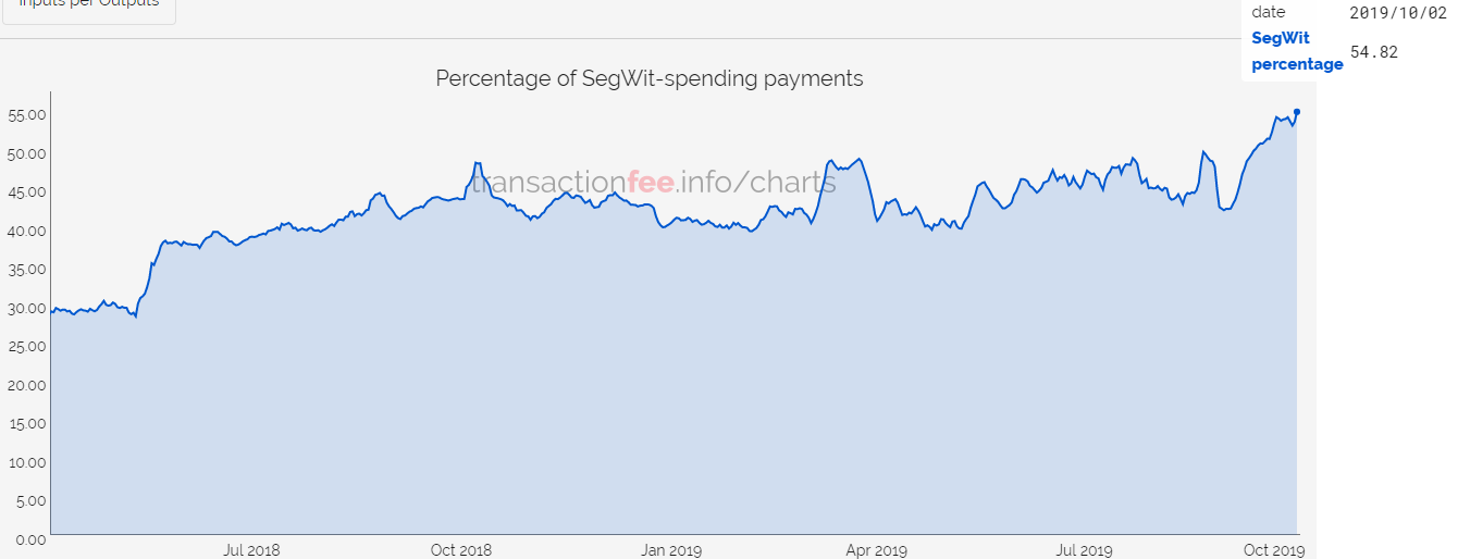 По данным transactionfee.info, в настоящее время технология SegWit задействована в 54% биткоин-транзакций: