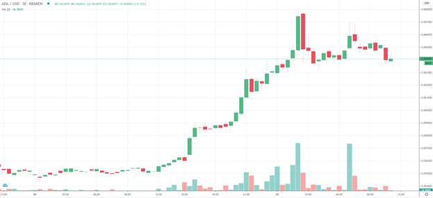 Сообщения с подкаста сообщества Cardano, на котором Хоскинсон анонсировал даты перехода на обновление Shelley не остались незамеченным рынком. Цена монеты ADA в паре с долларом по итогам четверга подскочила на 17,8% (данные биржи Kraken). В настоящий момент котировки консолидируются вблизи уровня в $0,065.