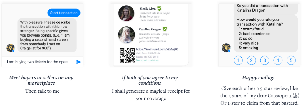 Принцип работы чат-бота заключается в следующем: пользователь, который собирается сделать покупку на такой площадке, посещает специальный веб-сайт «Кевина». Далее, нажимая «Get insured» (Застраховаться), он перенаправляется в мессенджер сети Facebook. Там бот запрашивает детали сделки, выдает информацию о рисках контрагентов и репутацию каждой из сторон. Если уровень репутации высок, создается транзакция со сведениями о данной сделке.