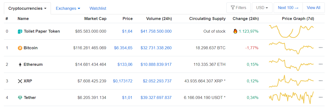 CoinMarketCap «отпраздновал» День смеха, поместив Toilet Paper Token выше биткоина