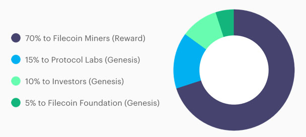 Из общей запланированной эмиссии FIL в 2 млн монет компания-разработчик Protocol Labs получит 15% (300 млн токенов), а Filecoin Foundation 5% (100 млн токенов). Передача прав (вестинг) должна происходить линейно.