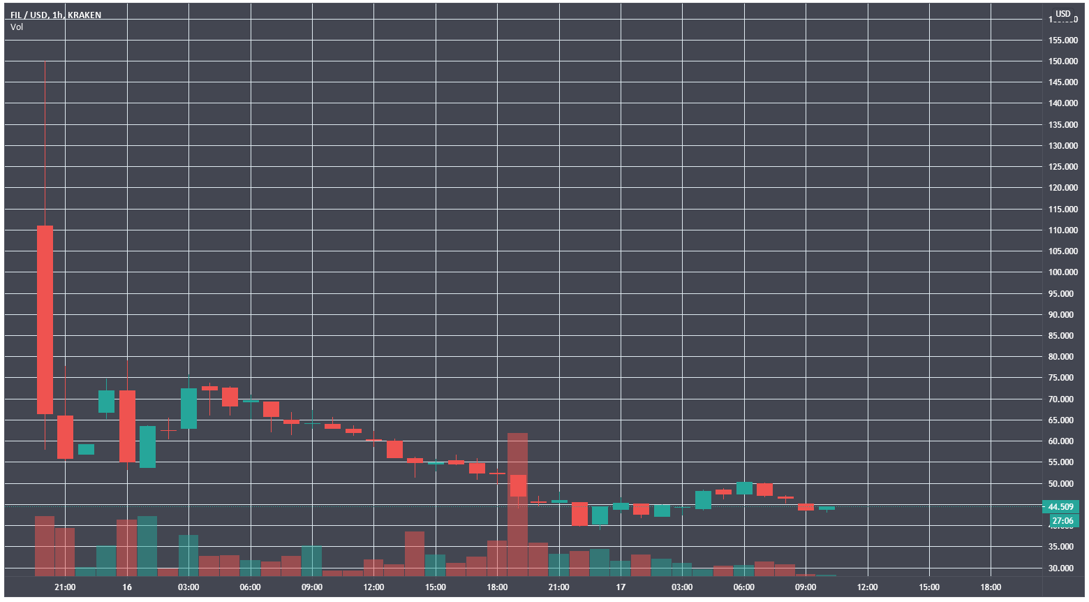 После запуска в четверг, 15 октября, основной сети Filecoin токен попал в листинг многих крупных бирж. На Kraken цена FIL, в моменте достигавшая $150, на момент написания опустилась ниже $45.