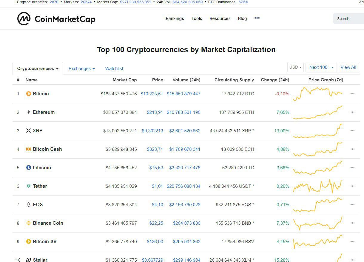 На момент написания материала чарт CoinMarketCap выглядит привычным образом, биткоин торгуется в районе $10223, однако его доля в общей капитализации криптовалютного рынка снизилась до 67,6% на фоне ралли большинства ведущих альткоинов.