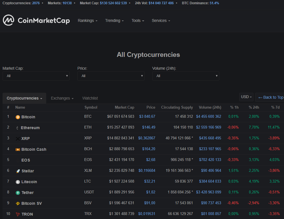 Общая капитализация рынка — $130 млрд, индекс доминирования биткоина — 51,4% (у Ethereum этот показатель составляет 11%).
