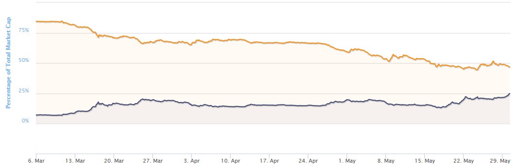 Как свидетельствуют данные Coinmarketcap, во вторник, 30 мая, объемы суточных торгов Ethereum впервые за все время оказались выше соответствующих показателей биткоина, сообщает Coin Telegraph.