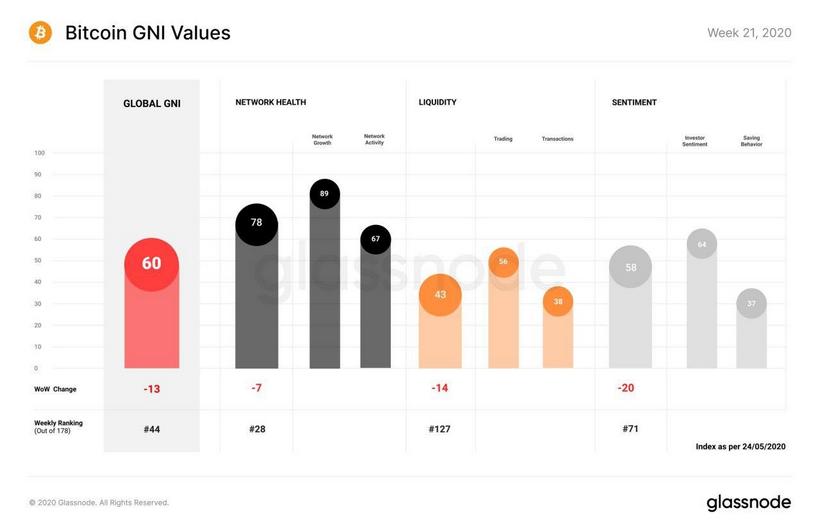 Индекс GNI, отражающий общее состояние блокчейна биткоина, опустился до 60 пунктов на этой неделе, потеряв 17,8%. Аналитики связывают это с падением рыночной стоимости BTC ниже уровня $9000.