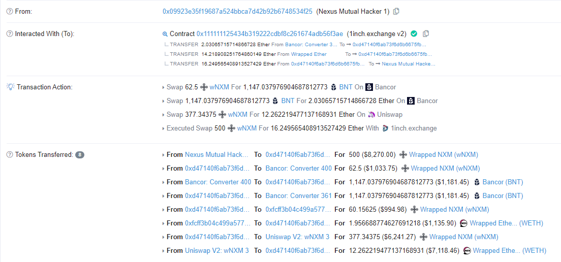 Согласно данным Etherscan, он уже начал конвертировать токены в Ethereum (ETH). Похищенные NXM составляют около 5,5% от общей эмиссии монеты.