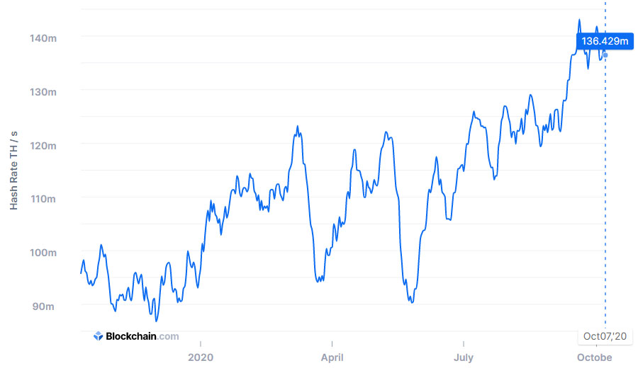 По данным Blockchain.com, показатель составляет 134,4 EH/s.