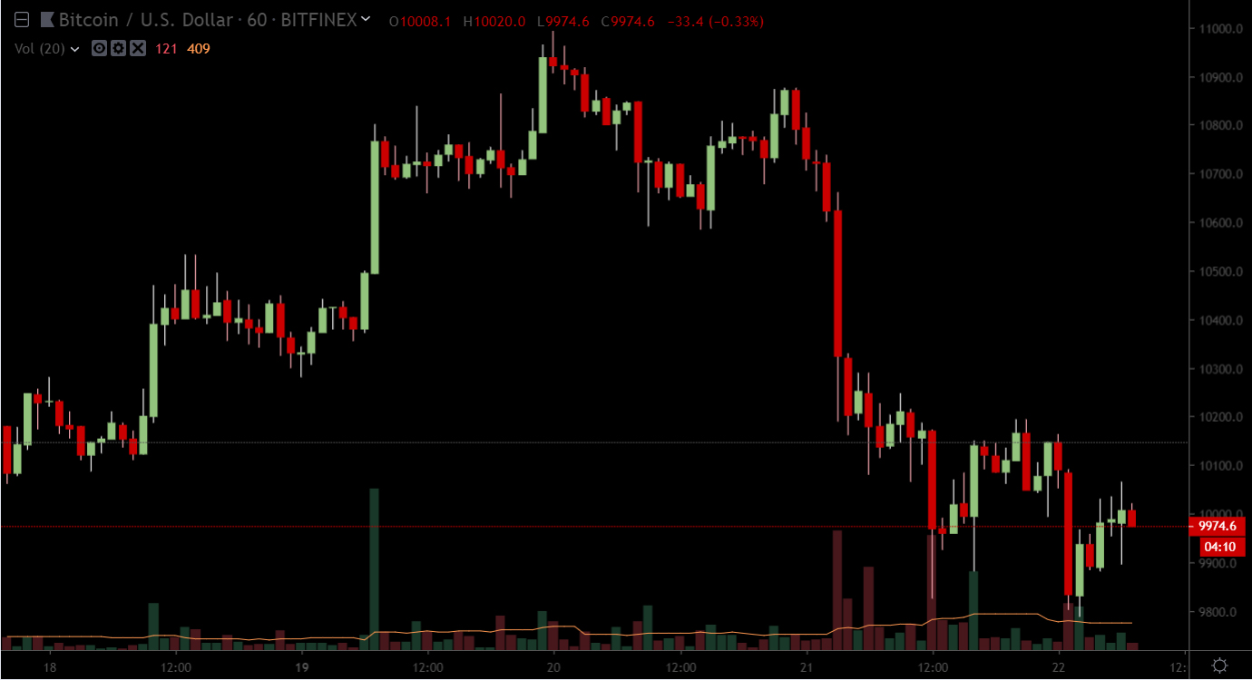 Дальнейшего роста, как на это надеялись инвесторы, однако, не произошло. Более того, за последние сутки BTC опускался ниже $9 800, торгуясь на момент публикации чуть ниже $10 000.