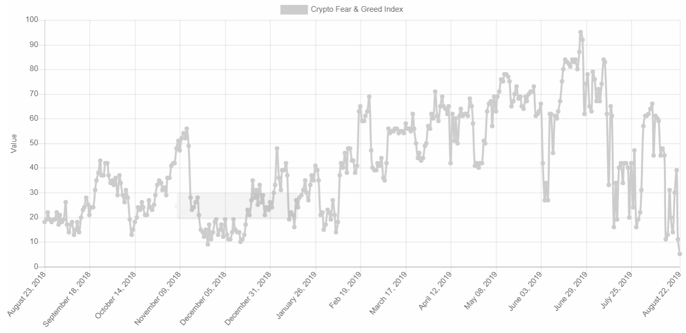 На фоне очередного снижения цены биткоина, вслед за которым в «красную зону» ушло большинство ведущих альткоинов, криптовалютный «индекс страха и жадности» упал до рекордно низкого значения в 5 пунктов.