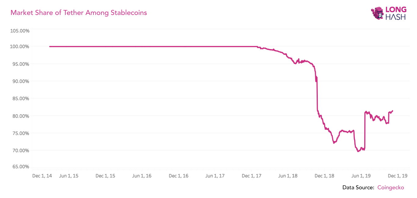 Также исследователи LongHash отметили, что с течением времени доля Tether на рынке стейблкоинов постепенно снижается: