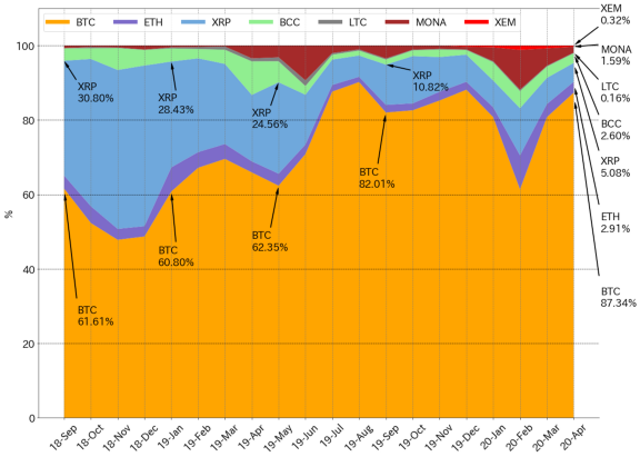 Популярность XRP в стране стремительно снижается. До середины 2019 года доля альткоина в торговых объемах в моменте превышала 30%. С этого времени показатель доминирования биткоина опустился ниже 70% только в феврале на фоне аномального роста интереса трейдеров к токену MONA.