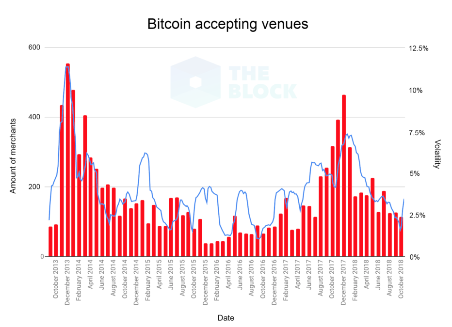 Также исследователи The Block указывают на тесную корреляцию между ценой биткоина и количеством новых дружественных к нему мерчантов.