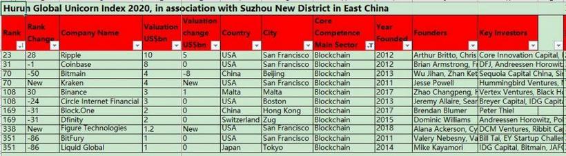Выборка блокчейн-единорогов из Hurun Global Unicorn Index 2020.
