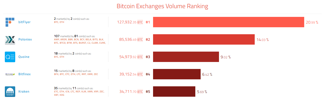 Абсолютным лидером по суточному объему торгов, как и прежде, является японская биржа bitFlyer (20,99%), на которой торгуются всего две валютные пары: BTC/JPY и ETH/BTC.