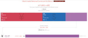 Среди наиболее популярных фиатных валют, торгуемых против биткоина, наиболее популярна японская иена (48,24%) доллар США (26,91%) и китайский юань (9,21%).