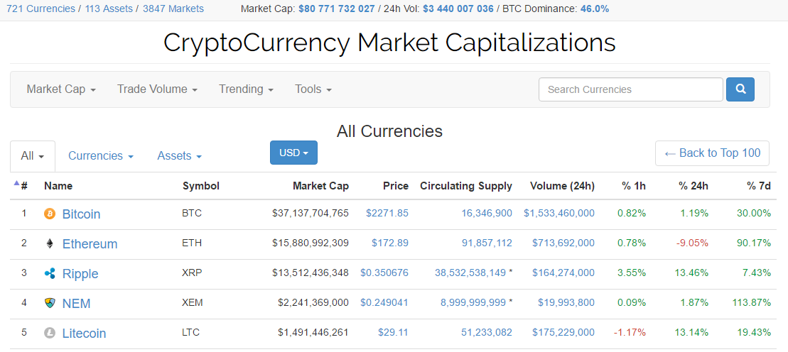 По данным сервиса Coinmarketcap, суточный оборот криптовалют составил $3,4 млрд. Несмотря на экспоненциальный рост биткоина, по своей капитализации он по-прежнему уступает альткоинам и его индекс доминирования состаляет всего 46%.