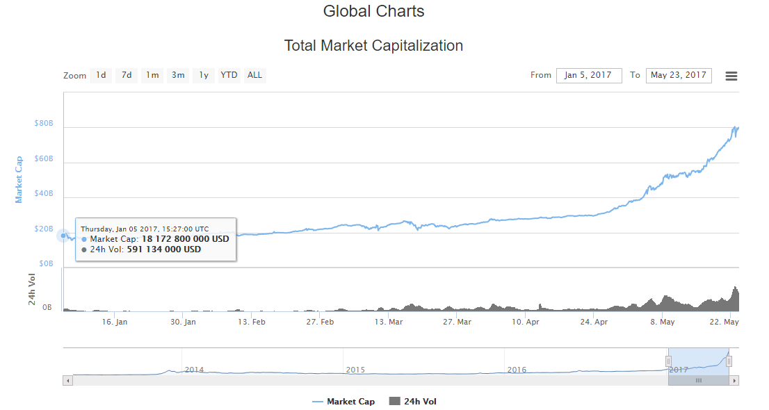 Как видно из данных графика, с начала года общая капитализация рынка криптовалют выросла почти в 5 раз.