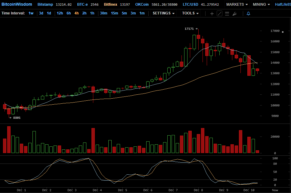Тем временем, в преддверии запуска фьючерсов на CBOE на рынке царят неопределенность и “медвежьи настроения”. Всего за три последних дня цена биткоина упала примерно на четверть (по сравнению с пиковыми значениями в районе $17 000).