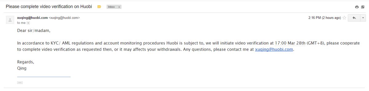 В частности, клиенты крупной китайской криптобиржи Huobi получили письма о необходимости прохождения видеоверификации в связи с изменениями политики KYC/AML (“Знай своего клиента”/”Противодействие отмыванию денег”). В рассылке указано, что процедура необходима для возобновления возможности вывода средств.