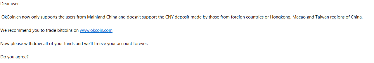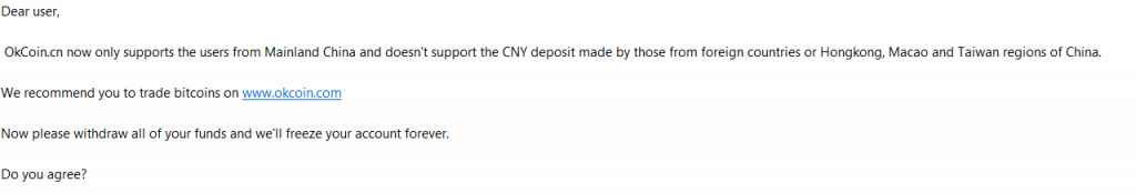 После ряда технических нюансов, своей цели автор треда все же добился, получив в процессе и письмо от службы поддержки OKCoin, в котором подтверждается, что биржа приостановила обслуживание иностранных клиентов.