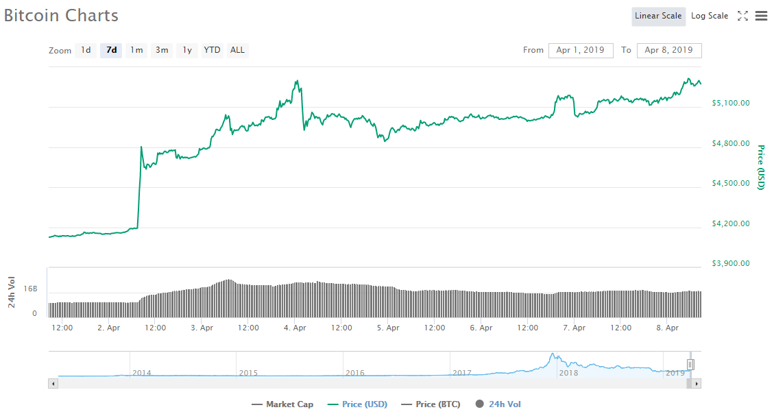 Тем временем средневзвешенный курс биткоина за последние сутки вырос на 2,63% и на момент публикации составлял $5 283, что является рекордным показателем с начала года. За последние семь дней первая криптовалюта поднялась цене на 27,8%.