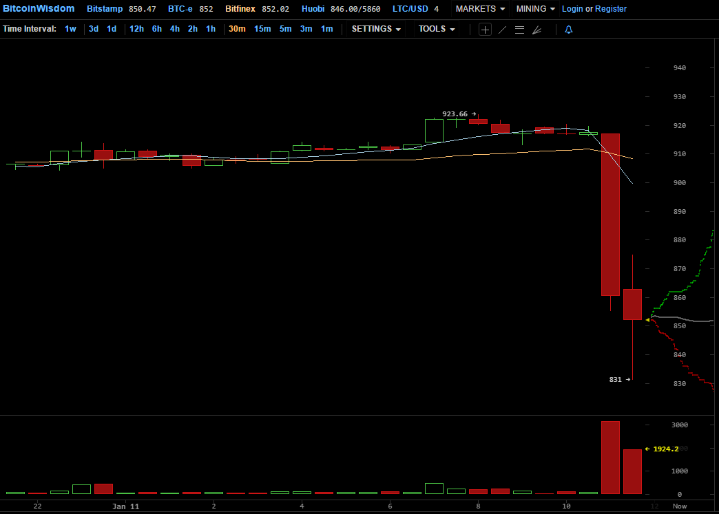 Рынок моментально отреагировал на эту новость обрушением курса биткоина – всего за несколько минут стоимость криптовалюты значительно упала. На момент публикации (09:45 UTC) биткоин торгуется в районе $850.