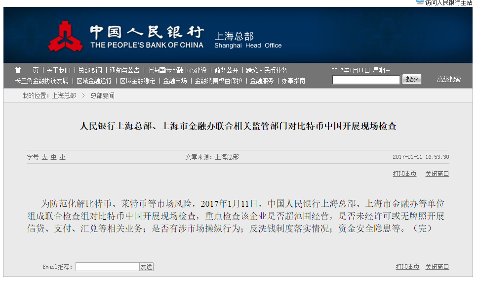 Согласно сообщению, 11 января 2017 года подразделение Народного банка Китая в Шанхае, Шанхайское муниципальное бюро финансов и другие подразделения Объединенной инспекционной группы Китая, принимая во внимание рыночные риски, начали проверку деятельности BTCC с целью защиты клиентов.