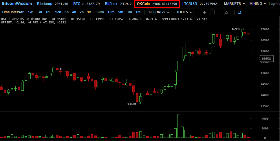 В настоящее время цена биткоина на китайской криптобирже OKCoin значительно выше, чем на других ведущих биржах, включая Bitfinex, Bitstamp и т. д.