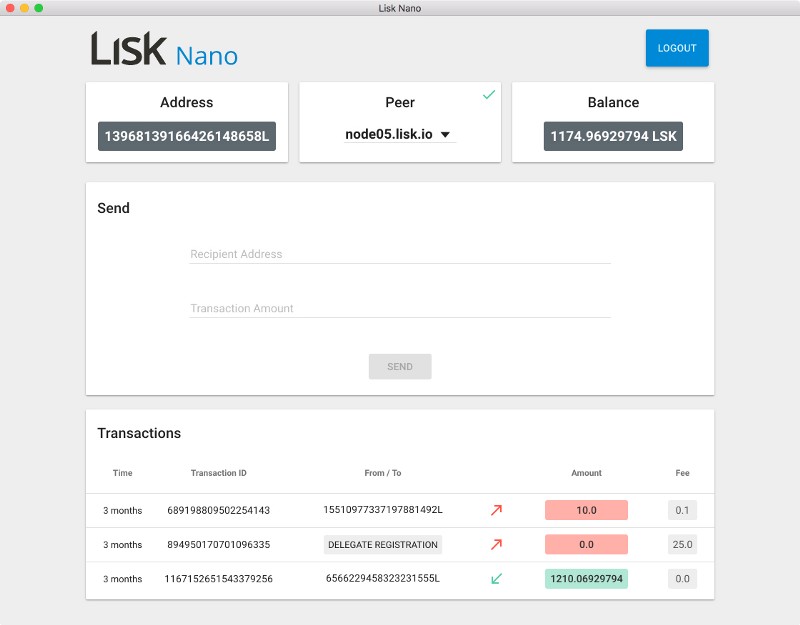 При помощи Lisk Nano пользователи получают возможность создавать и входить в аккаунты, отправлять и принимать токены LSK, просматривать входящие и исходящие транзакции.
