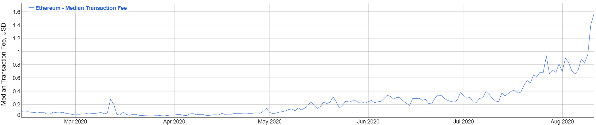 Транзакционные комиссии в сети Ethereum продолжают стремительно расти. Во вторник, 11 августа, медианный показатель достиг $1,57, обновив максимум с начала 2018 года.