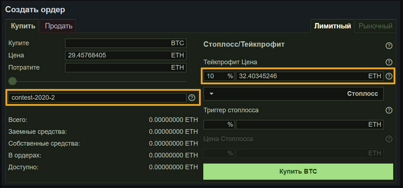 • при размещении ордеров устанавливать тейк-профиты и примечание «contest-2020-2». Тейк-профит и цену исполнения можно будет изменить до нужного уровня;