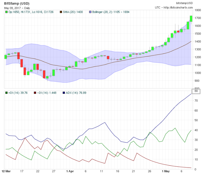 Данные технических индикаторов свидетельствуют о сильной перекупленности биткоина. В частности, трендовый индикатор ADX и полосы Боллинджера на дневном графике биржи Bitstamp показывают высокую вероятности коррекции цены: