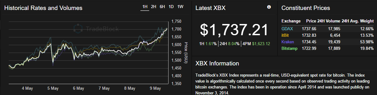Согласно данным биткоин-индекса TradeBlock, средневзвешенная цена первой цифровой валюты за сутки выросла на 8% и в настоящее время составляет $1737 за 1 BTC.