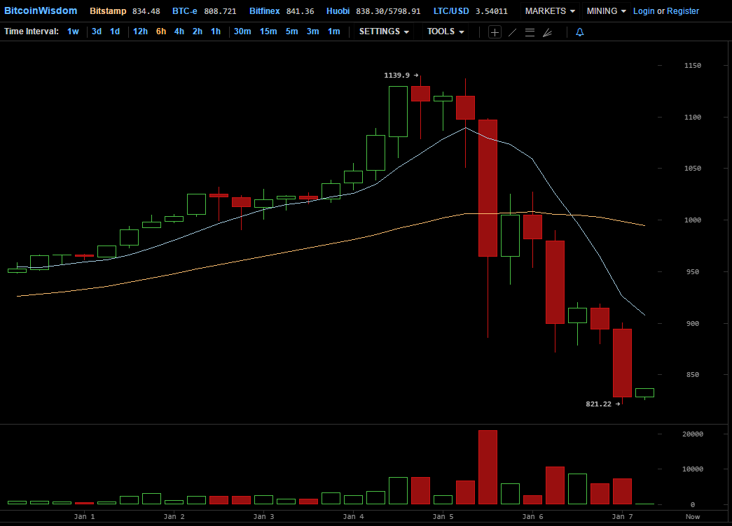 На момент публикации курс биткоина несколько выровнялся и торгуется в районе $838, однако общее снижение за последние сутки составило более 15%.