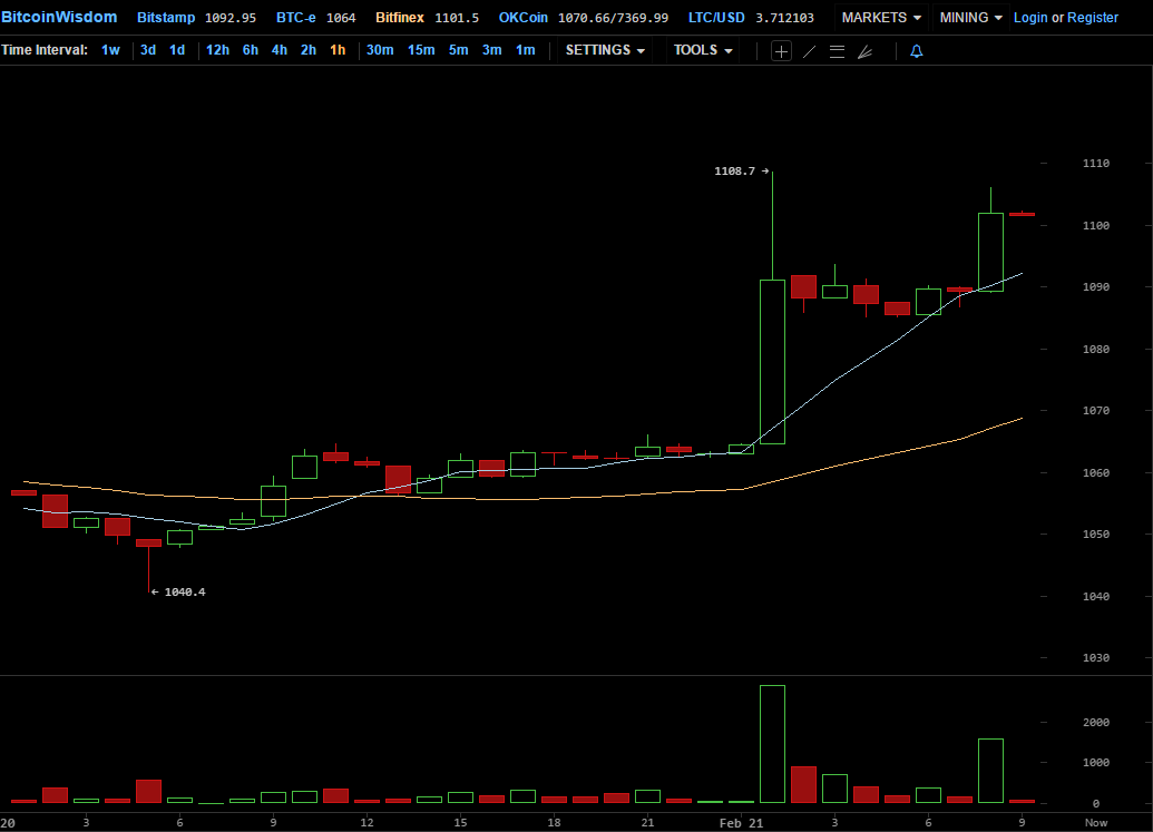 Утром во вторник, 21 февраля, курс биткоина превысил на целом ряде бирж отметку в $1100. Последний раз криптовалюта торговалась на этих высотах в первых числах января.