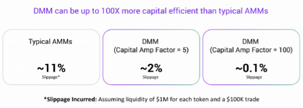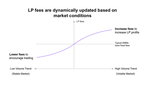 В DMM в зависимости от меняющихся условия на рынке алгоритм будет оптимизировать размеры комиссий для тейкеров и сборов для поставщиков ликвидности. Для повышения эффективности размещаемого капитала будет задействован механизм программируемой кривой ценообразования.