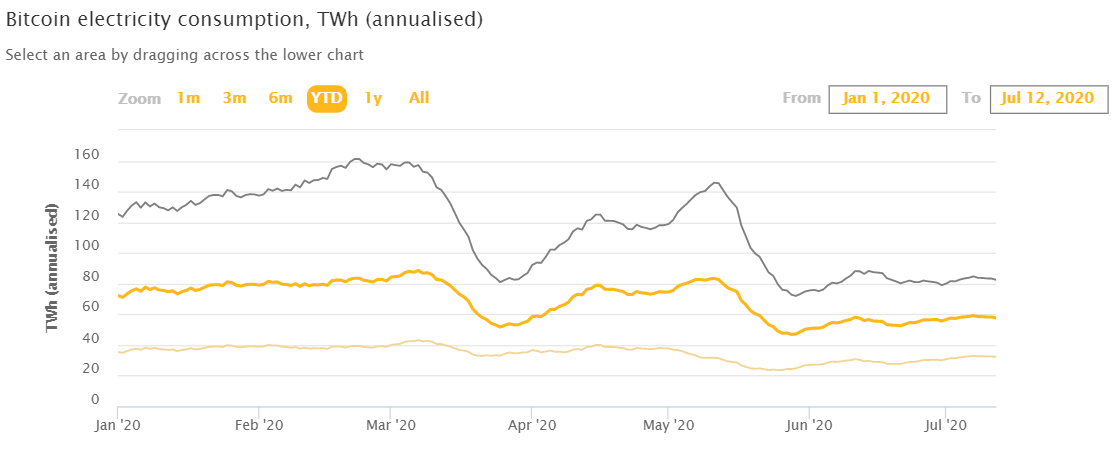 Разработанный в Кембридже индекс потребления электроэнергии майнерами отражает иные цифры. Согласно ему, на текущий момент средний показатель потребления энергии равен 58,24 ТВт·ч/год, а 11 мая он достигал 83,43 ТВт·ч/год.