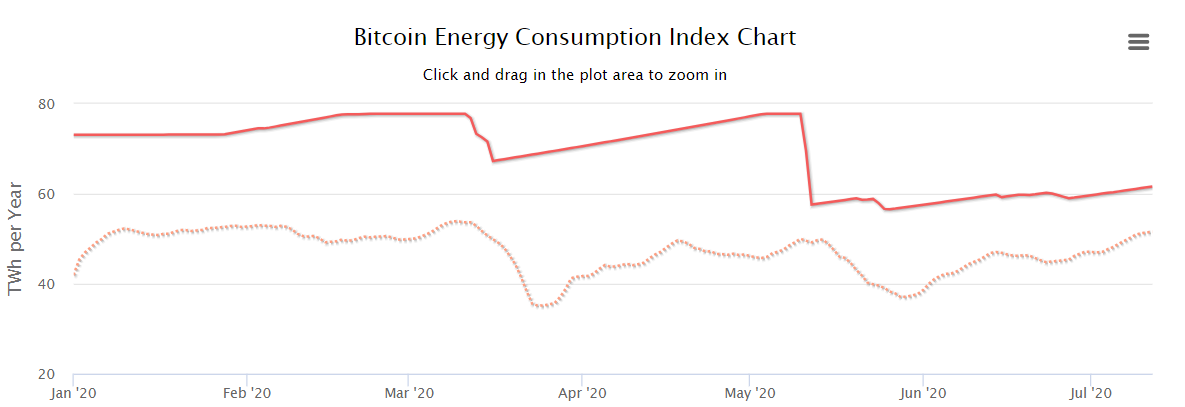 Через две недели после халвинга этот показатель опустился на 24%, с 77,78 ТВт·ч/год до 57,9 ТВт·ч/год. На текущий момент он составляет 61,44 ТВт·ч/год.