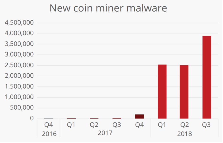 В 2018 году скрытый майнинг стал одной из ключевых опасностей в киберпространстве. Только в третьем квартале команда McAfee Labs обнаружила около четырех миллионов угроз со стороны вирусов-майнеров. В 2016 и 2017 годах количество таких угроз не превышало 500 тысяч.