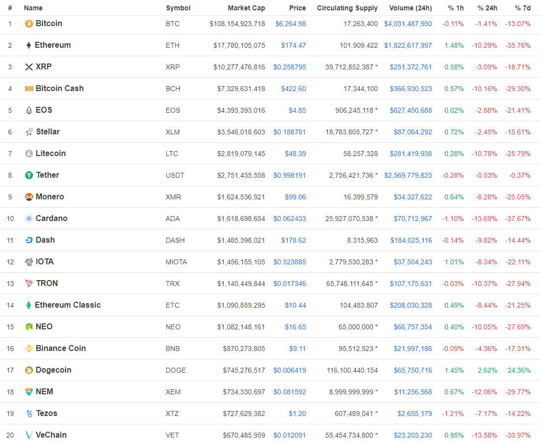 Биткоин на данный момент торгуется в районе $6264 (-1,4%), средневзвешенный курс Ethereum опустился до $174.47 (-10,29%). В Топ-20 CoinMarketCap особняком по-прежнему стоит Dogecoin – за последние сутки эта криптовалюта выросла на 2,62% (+24,36% за неделю) и, обогнав по капитализации Nem, Tezos и VeChain, поднялась уже на 17-е место.