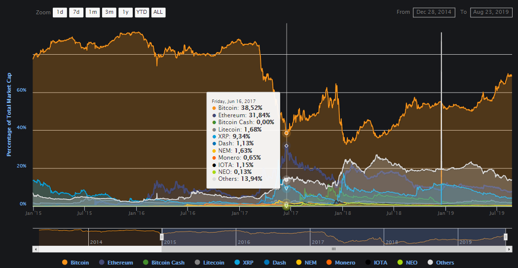 Действительно, если проанализировать исторические данные CoinMarketCap, выяснится, что, например, в начале 2017 года индекс доминирования биткоина был даже выше, чем сейчас — около 85%. Однако уже к середине июня того же года этот показатель упал ниже 40%.