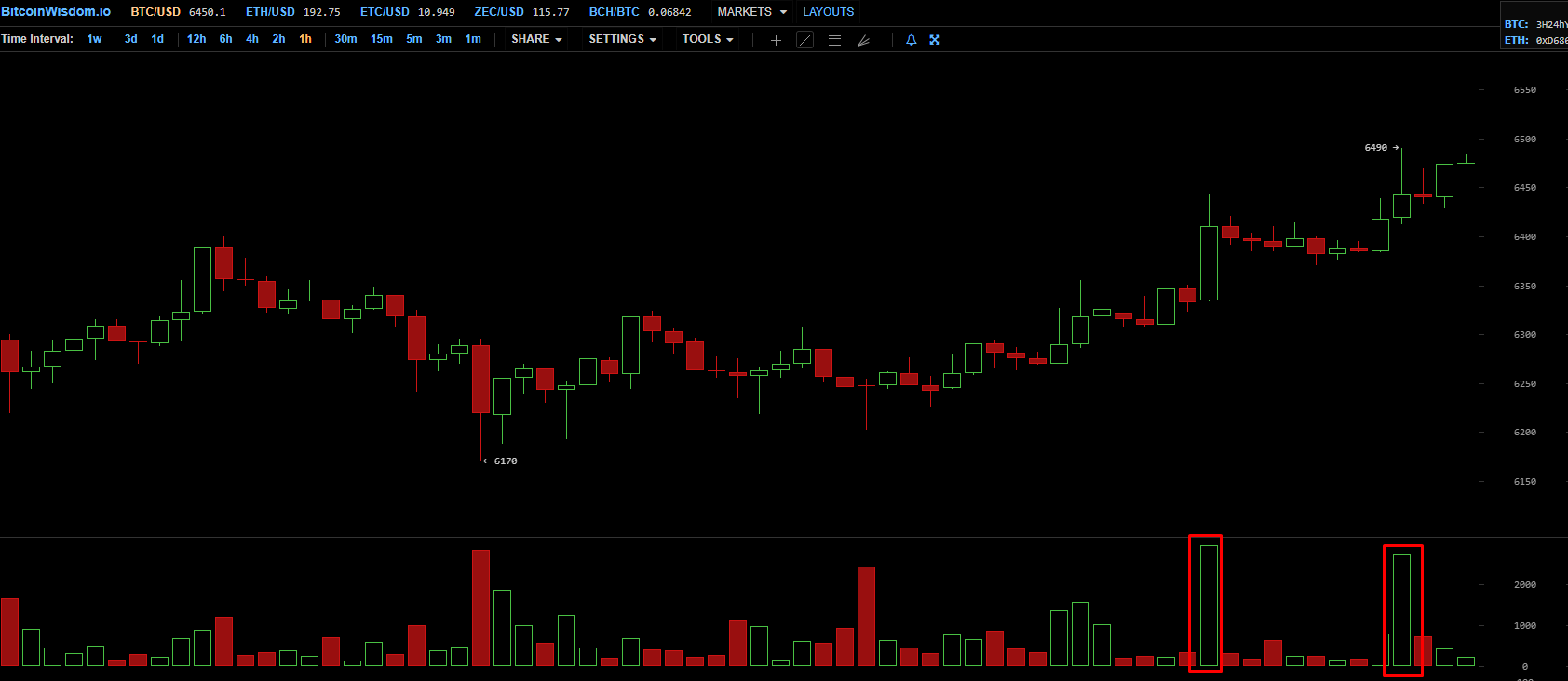 В течение последних суток цена биткоина в целом демонстрирует восходящее движение, периодически сопровождающееся ростом объемов торгов: