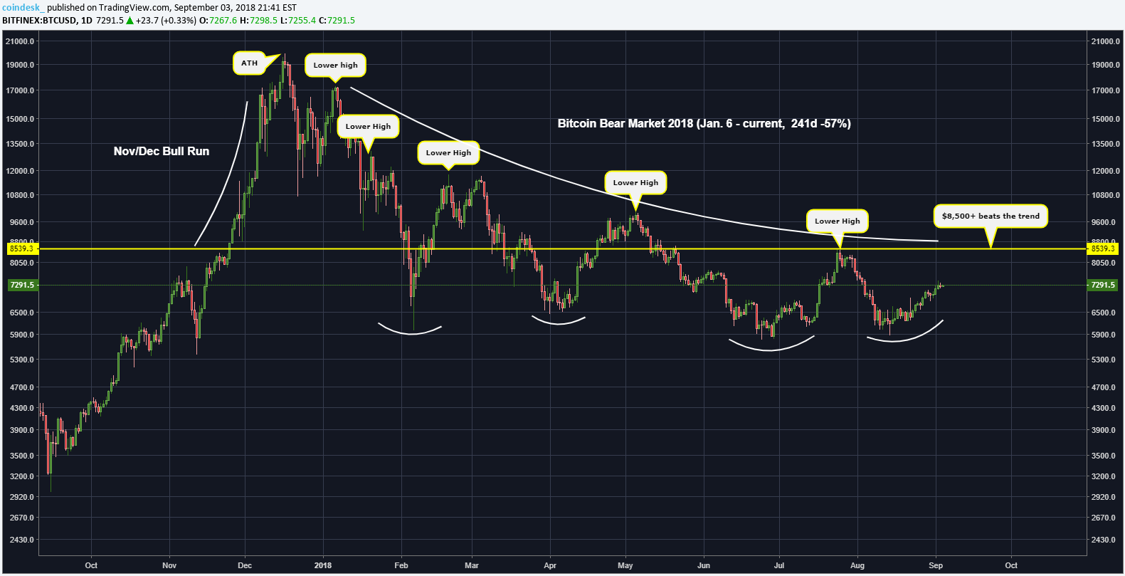 По мнению аналитика CoinDesk Себастьяна Синклера, для начала фазы устойчивого роста цене биткоина нужно уверенно пробить отметку $8500.