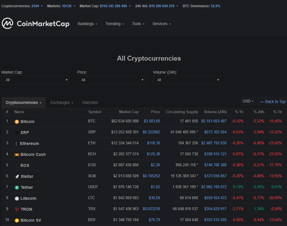 Вчера, 13 января, цена биткоина закрылась на отметке $3516 преломив непродолжительный восходящий коррекционный тренд. На рынке явно доминируют продавцы и, в частности, так сейчас выглядит первая десятка CoinMarketCap: